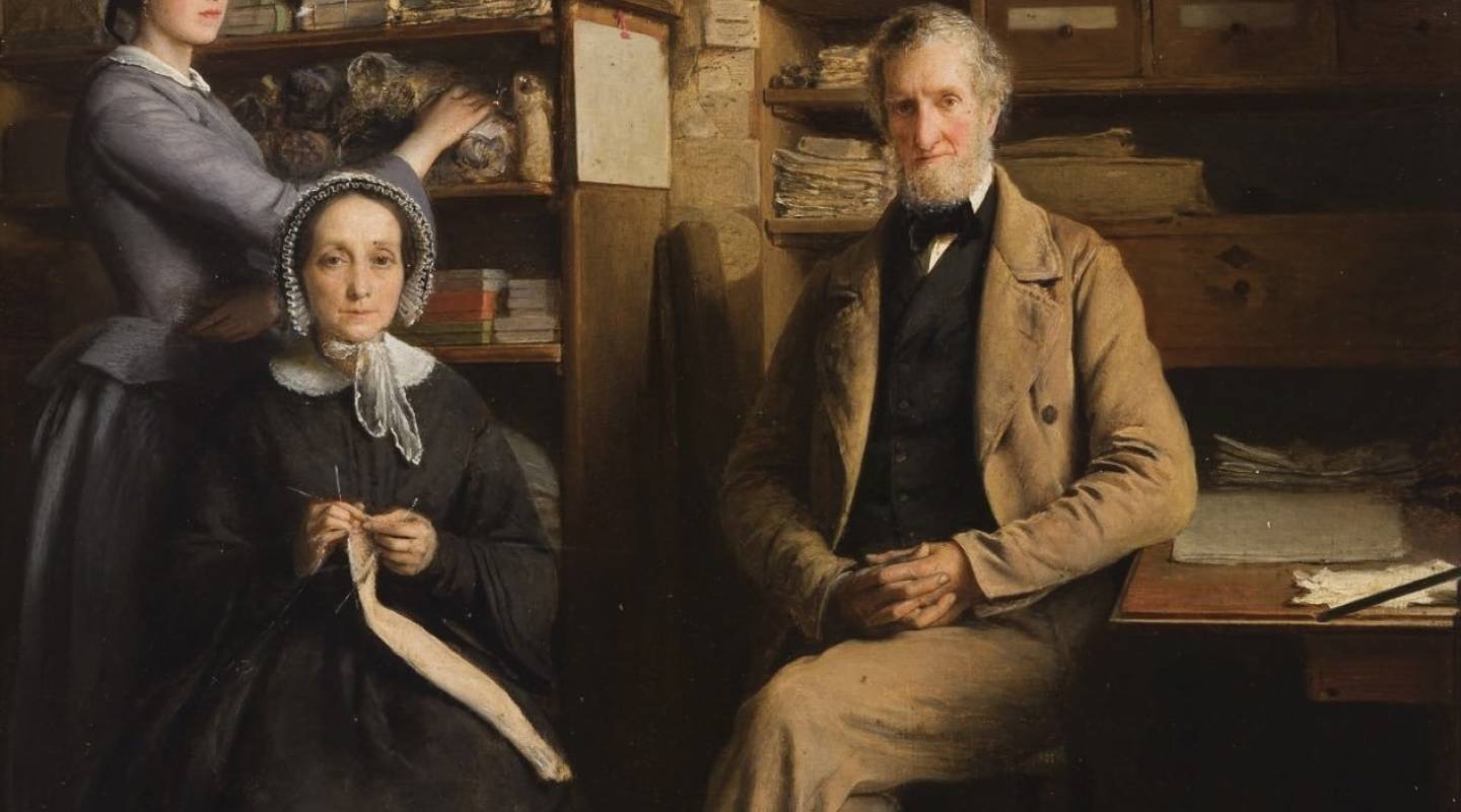 Auf der linken Bildhälfte ist ein älterer Mann mit kurzen, grauen Haaren und Bart in einem braunen Anzug zu sehen. Mit einer aufrechten Pose sitzt er schräg an einem Schreibtisch. Links von ihm sitzt eine strickende Frau mit Haube und schwarzem Kleid. Hinter ihr scheint eine junge Frau in einem blaugrauen Kleid etwas aus dem Regal zunehmen. Im Hintergrund befinden sich Regale mit Bücher und verschiedenen Materialien.