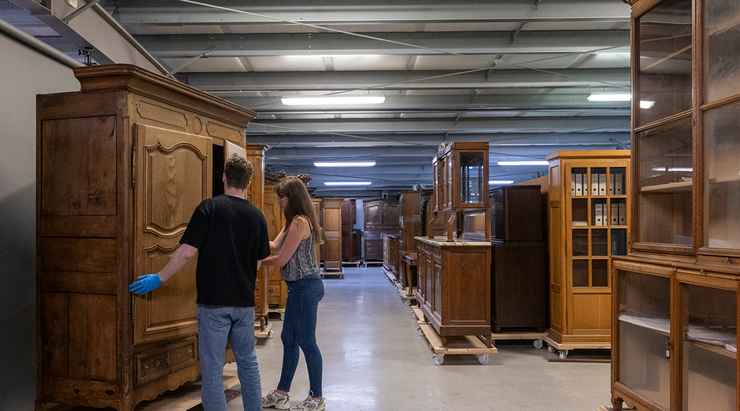 Bereits im April 2021 berichtete Patrick Quinteira (Sammlungsmanager des MNAHA) im MuseoMag über dieses umfangreiche Vorhaben im Hinblick auf die Möbel, bei dem nicht nur die Sammlungsliste der Abteilung Arts décoratifs et populaires aktualisiert wurde, sondern auch die schweren Schränke auf Rollbrettern montiert wurden, um somit deren Handhabung einfacher zu gestalten. Derart gut vorbereitet, ging es dann zügig voran. Mittlerweile konnten, die gesamte Möbelsammlung zusammengezählt – Schränke, Truhen, Stühle, Tische, Sekretäre, Uhren und weitere –, etwa 1000 Möbel in die digitale Datenbank aufgenommen werden. Darunter befinden sich auch etwa einhundertfünfzig Schränke.
