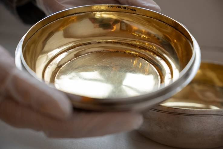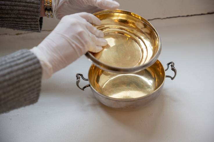 Es ist jedoch kaum vorstellbar, dass eine so wertvolle Silberschale lediglich dem Transport einer Mahlzeit über einen sehr begrenzten Zeitraum diente. Auch damals, als Plastik natürlich noch nicht erfunden war, hätte man praktischere und billigere Materialien zur Verfügung gehabt. Was also hat es mit der Schale auf sich? Zur Beantwortung dieser Frage hilft die für jene Art von Gefäß im deutschen Sprachraum ebenfalls übliche Bezeichnung als Godenschüssel weiter. Nicht selten übernahm nämlich die zukünftige Taufpatin des/der Neugeborenen – in vielen deutschen Dialekten wird die Patentante God oder Godel genannt, was etymologisch mit den luxemburgischen Bezeichnungen Giedel oder Gued verwandt ist – die Aufgabe, die Wöchnerin mit kräftigenden Speisen zu versorgen. So entwickelten sich aus anfangs vermutlich schlichten Transportbehältern im Laufe der Jahrzehnte schön gestaltete und auch aufgrund des Materials wertvolle Zierschalen, die dann zugleich als bleibendes Taufgeschenk dienten. Die praktische Bedeutung als Schale to go trat in den Hintergrund zugunsten des symbolischen und materiellen Wertes. Man kennt aus dieser Zeit äußerst aufwendig gefertigte Godenschalen mit ausgefallenen Verzierungen und dem Anlass entsprechenden Inschriften, die fast zu schön für den Gebrauch sind. Auch bei der Neuerwerbung kann es sich allein aufgrund des Materialwerts – die massiv silberne Schale wiegt 549 Gramm – um ein solches Taufgeschenk gehandelt haben. Die Innenseite ist zudem vergoldet, was die Doppelschale zusätzlich aufwertet.