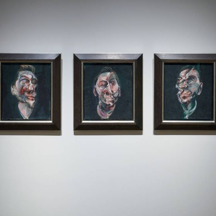 Francis Bacon (1909-1992), Three Studies for Portrait of George Dyer, 1963, oil on canvas, in three parts, 35.5 x 30.5 cm (each). The first publicly listed Masterpiece on Artex Global Markets. Owned by Art Share 002 © The Estate of Francis Bacon. All rights reserved, DACS 2024 / Photo: Tom Lucas / MNAHA