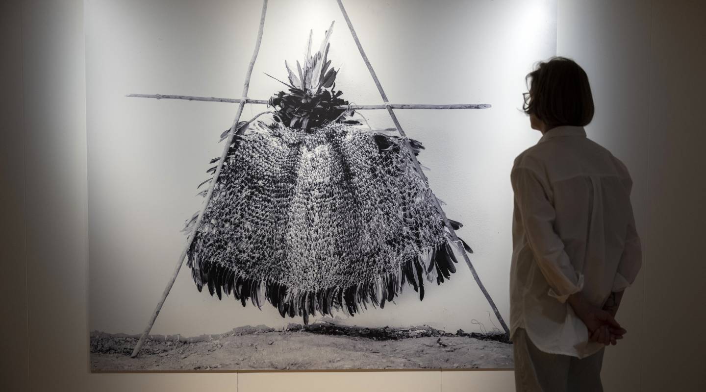 Sharing Gertz’s interest in dress as a marker of identity, Lívia Melzi’s prints focus on a collection of cloaks belonging to the Tupinambá tribe which were used in anthropophagic rituals and were removed from Brazil during the first centuries of the country’s colonisation. Blending sociological and artistic research, Melzi studies the reception of these sacred garments in Europe and their presentation in Western museums. Indeed, the way these institutions choose to display the cloaks says as much about their own belief system as it does about the objects themselves. Melzi’s photographs show the disembodied garments on display in various settings, underlining the importance of context in the meaning-making process.