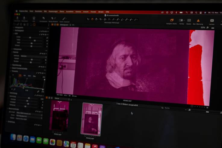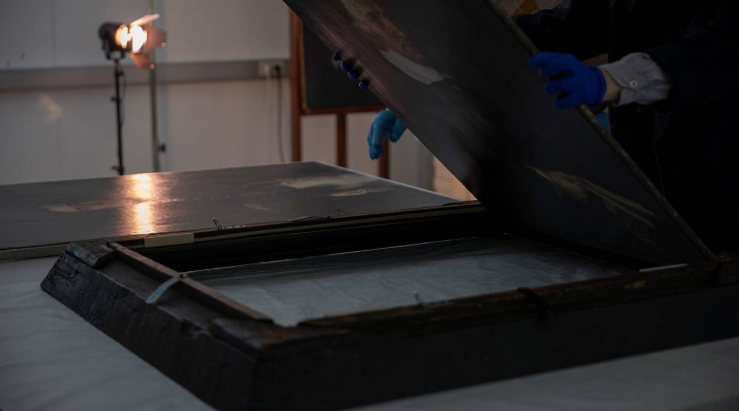 Infrared light allows us to dive into materials. At a longer wavelength than visible light, it passes through paint layers until it is absorbed or reflected back. In practice, this technique involves pointing an IR light source at the painting’s front. The light is then absorbed by certain materials like carbon-based substances, often used as drawing media. A specialised camera captures the contrast between reflected and absorbed light, revealing the underlying drawings. As this method did not help us detect any underdrawing in the Portrait of Andries Van Hoorn, we then used a complementary technique called transmitted infrared photography.For this analysis, the light source is placed behind the artwork and the camera in front of it. This produces an image with less contrast but greater translucency, helping us further understand the layers.