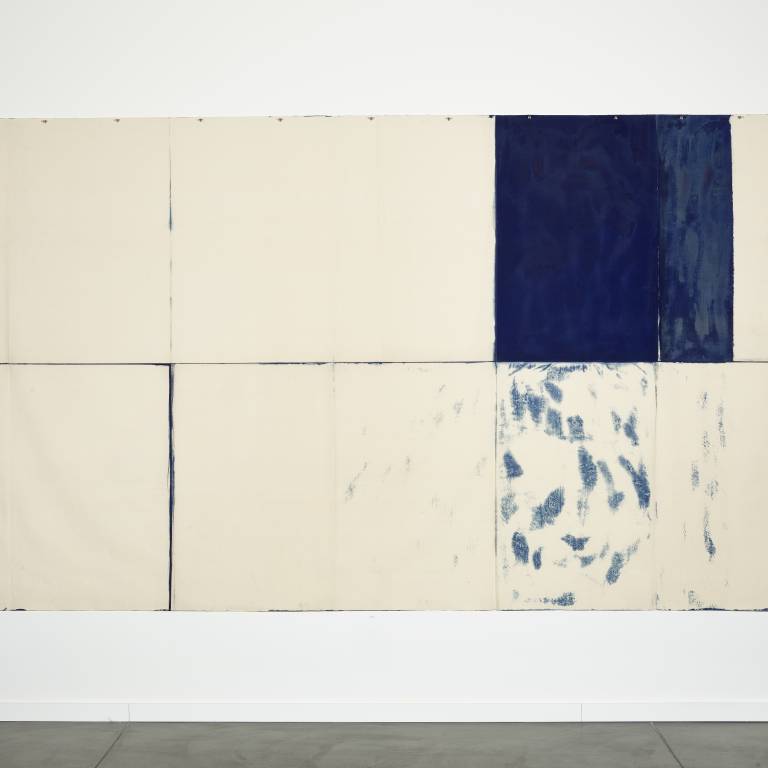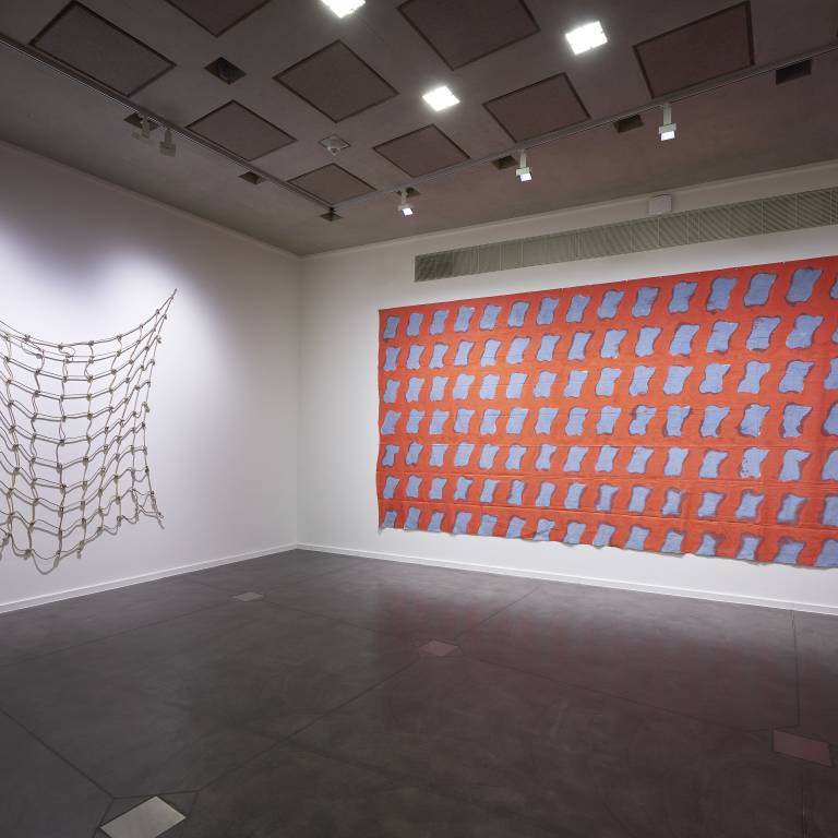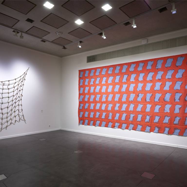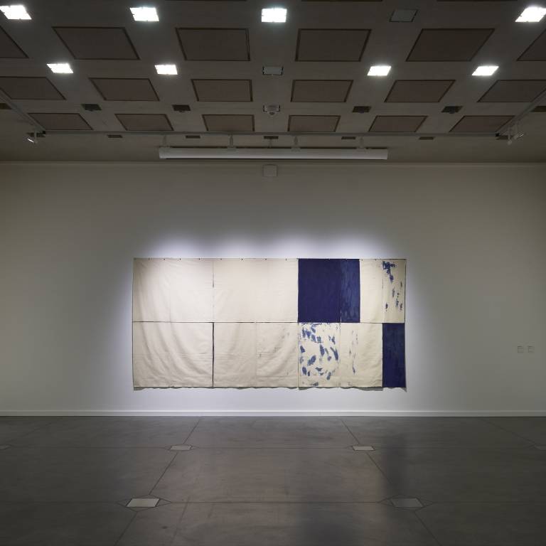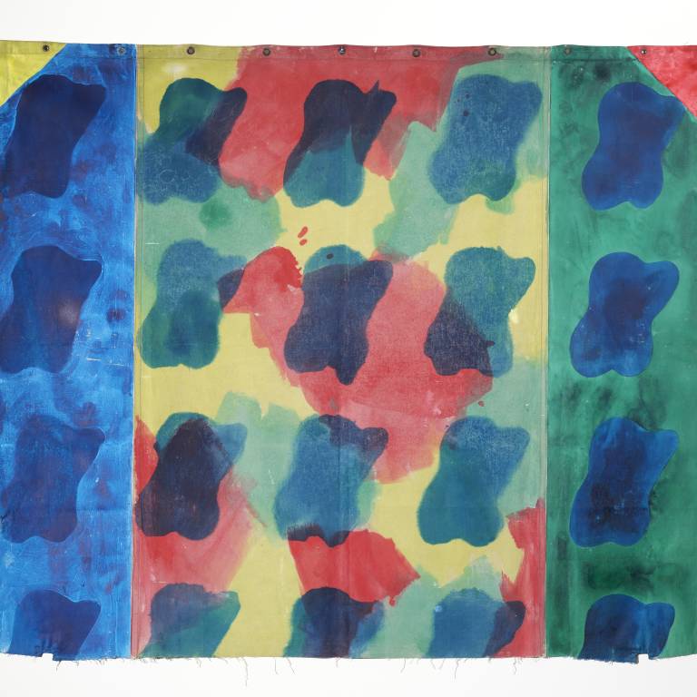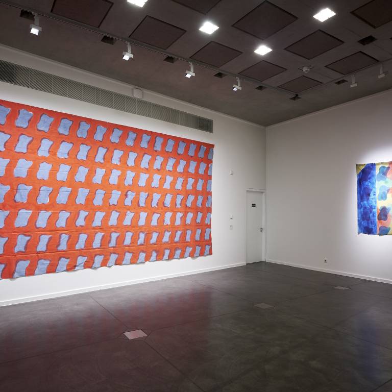 Claude Viallat (*1936) s’attache aux éléments primaires et structuraux de la peinture, soit la toile, la couleur et la surface. Dès 1966, il travaille sur la couleur, celle-ci étant à la fois sujet et objet. Le châssis disparaît. La toile libre est peinte et sur ce fond de couleur, Viallat place des empreintes au pochoir, de manière répétitive et sérielle. «Dezeuze peignait des châssis sans toile, moi je peignais des toiles sans châssis et Saytour l’image du châssis sur la toile», commentera l’artiste quelques années plus tard. Viallat est l’un des fondateurs et l’un des douze membres actifs du mouvement Supports/Surfaces. La plupart des oeuvres ici présentées montre que pour lui, la couleur est élémentaire pour souligner les formes répétées qui confèrent à son art des dimensions et un rythme cohérents, tout à fait caractéristiques du mouvement Supports/Surfaces.