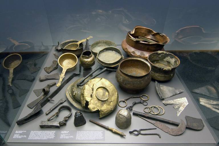 Pendant plus de 1700 ans, un lot d'objets, comptant plus de mille objets en argent, en bronze, en laiton et en fer et pesant plus de 700 kilos, était immergé dans les flots du Rhin près de Neupotz dans le Palatinat. Il s'agit du butin d'une expédition de pillage en Gaule romaine, perdu pendant le franchissement du fleuve par les envahisseurs germaniques dans la seconde moitié du IIIe siècle après J.-C. Le butin, retrouvé pour la plupart en 1980 en 1980 pendant l'extraction de gravier, se compose d'objets très divers : objets de culte, armes, monnaies, vaisselle de cuisine et de table, outils, accessoires de chars et de bateau. Des aliments, des vêtements et du bétail faisaient également partie du butin, qu'accompagnaient des hommes déportés, notamment des artisans pour leur savoir-faire.