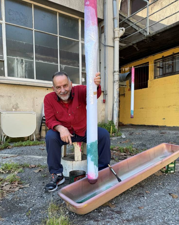 Noël Dolla partage les coulisses de son mode opératoire à ciel ouvert dans la cour de l’atelier Friche municipale du 109, à Nice. Ici a cours un travail de teinture d’un rouleau de tarlatane dans des couleurs diluées à l’essence: une bonne raison de travailler à l’air libre. (c) Loupio