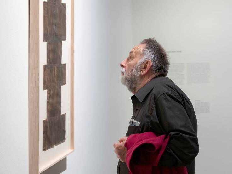 Noël Dolla en visite au musée, admirant une œuvre de Daniel Dezeuze (*1942) en bitume de judée et scotch sur papier.