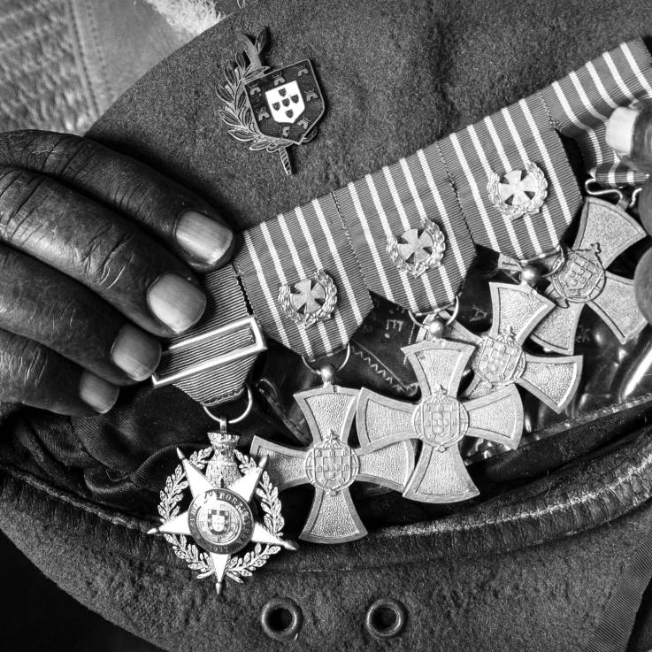 Première image. Plan serré sur la série de décorations du lieutenant-colonel Marcelino da Mata, originaire de Guinée-Bissau, qui fut l’un des fondateurs de la troupe d’élite Comandos. Ce cliché balaye d’emblée toute tentative d’interprétation manichéenne du conflit colonial. De fait, comme d’autres puissances coloniales, l’armée portugaise n’hésite pas à recruter au sein même de la population autochtone pour des raisons économiques et opérationnelles évidentes. Certaines recrues locales endossent même un rôle stratégique de premier plan, de sorte qu’on assiste à une «africanisation des forces portugaises face aux croissantes difficultés de recrutement en métropole », comme l’écrit Carlos de Matos Gomes dans le livre-photos d’Alfredo Cunha 25 de Abril de 1974. Quinta-Feira. «En 1973, les forces africaines représentaient 57% du total des effectifs déployés en Angola, 35% en Guinée et 56% au Mozambique.»