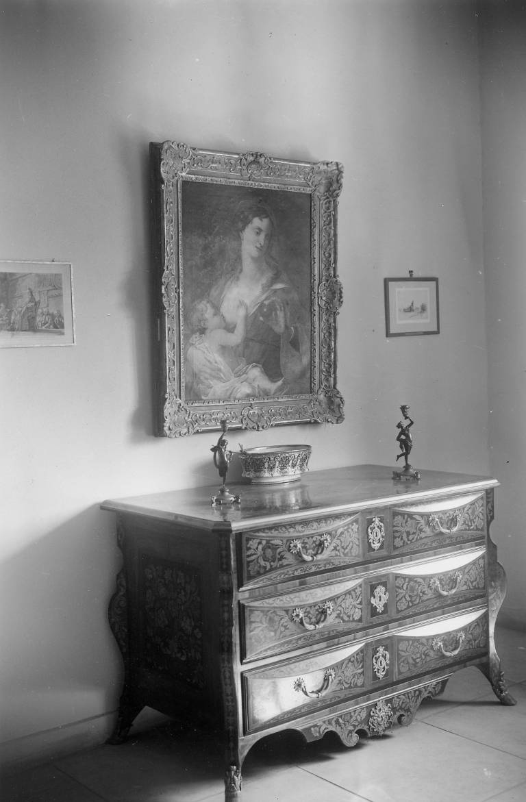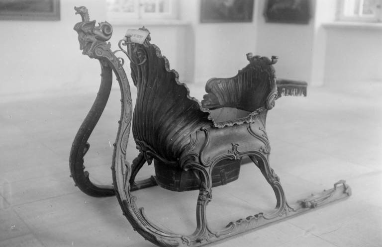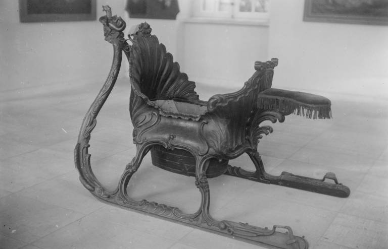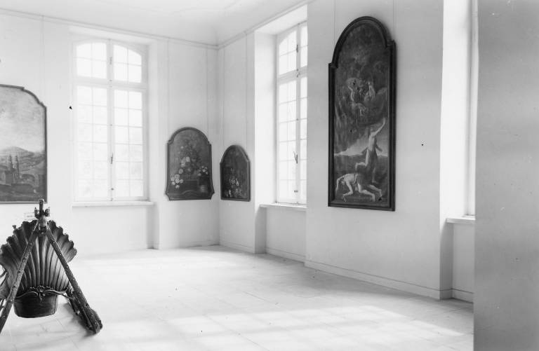 Tableaux provenant de la basilique et de l'abbaye d'Echternach avec, au centre de la pièce, un traineau 18e siècle, exposés en 1954.